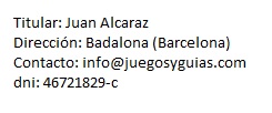 La información y servicios incluidos o disponibles a través del sitio https://www.juegosyguias.com pueden incluir incorrecciones o errores tipográficos. De forma periódica se incorporan cambios a la información contenida. Juan Alcaraz puede introducir en cualquier momento mejoras y/o cambios en los servicios o contenidos.